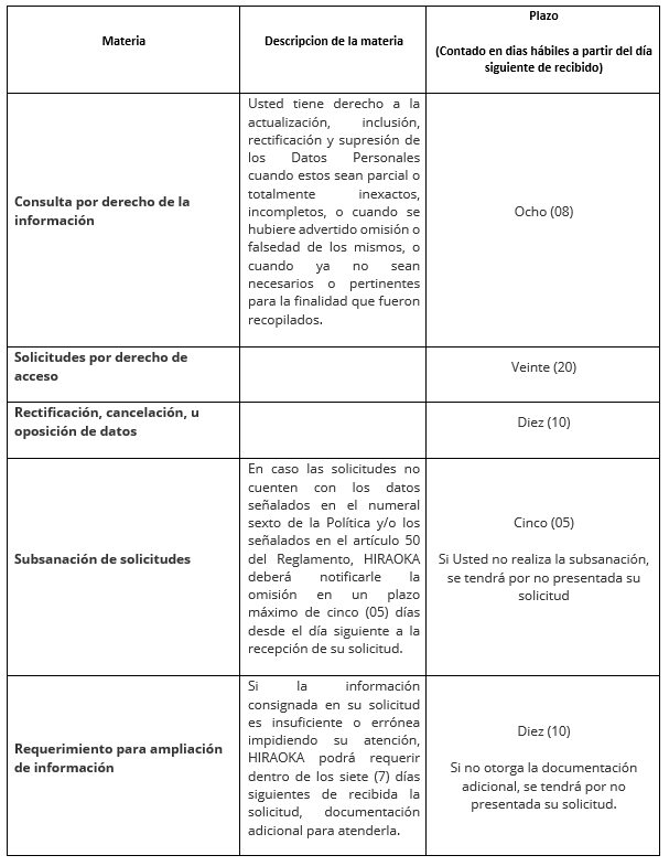 Al respecto, se informa que los plazos aplicables a las solicitudes, consultas, subsanación de consultas y/o requerimientos para ampliación de información, cuando ello corresponda; serán los estipulados a continuación, de conformidad con los plazos legales establecidos: