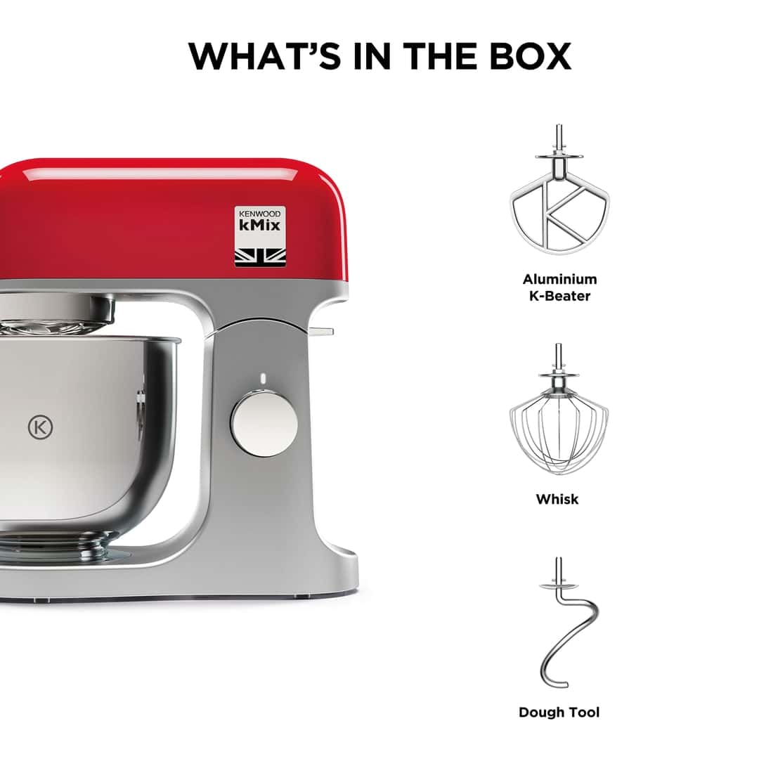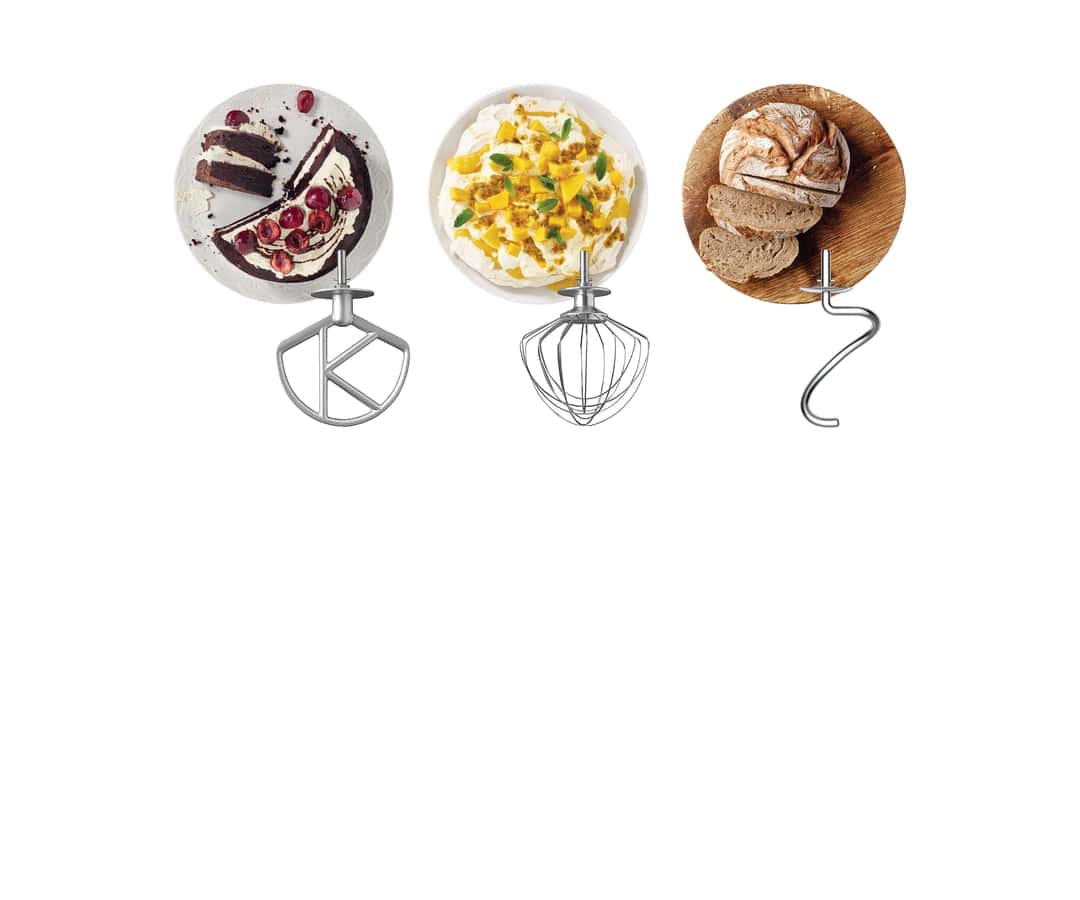 Siempre estarás a punto con un juego de tres resistentes herramientas. Cada kMix viene con una batidora de varillas, un gancho para amasar y nuestra exclusiva batidora K, un auténtico repostero todoterreno. Sirve deliciosos pasteles y panes en un abrir y cerrar de ojos.